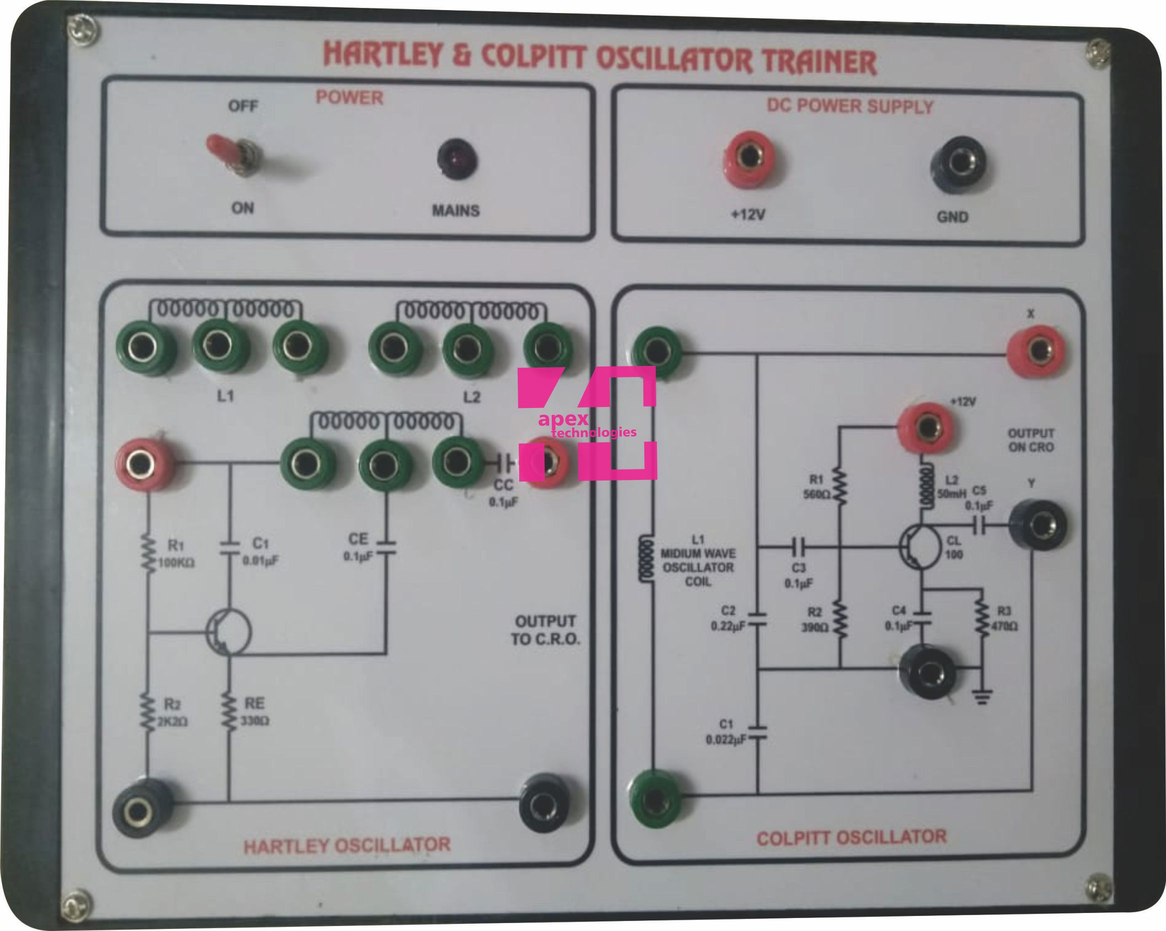 The basic configuration of the Colpitts Oscillator resembles that of the Hartley Oscillator but the difference this time is that the centre tapping of the tank sub-circuit is now made at the junction of a “capacitive voltage divider” network instead of a tapped autotransformer type inductor as in the Hartley oscillator …