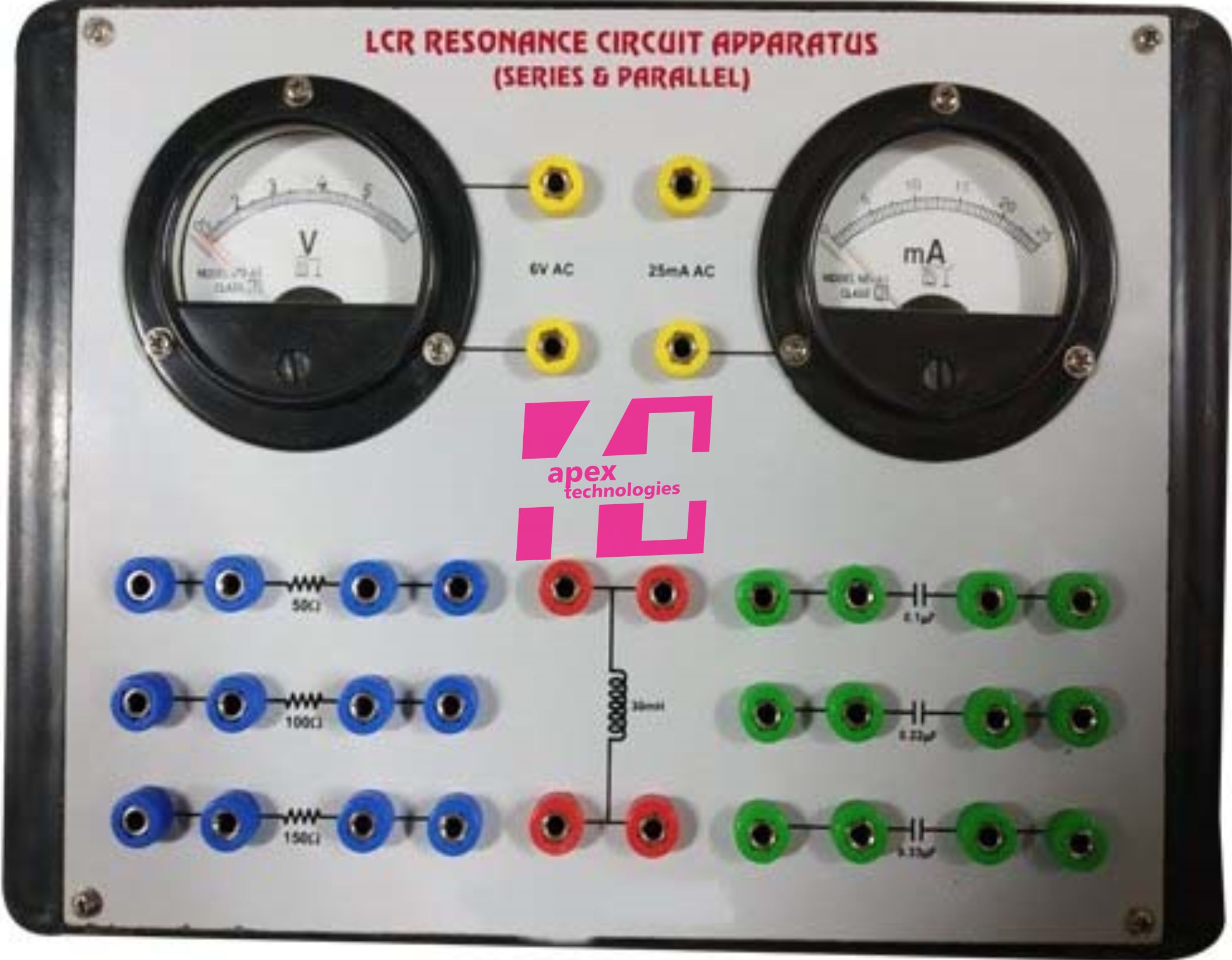 LCR Resonance Circuit has be designed to plot the Resonance curve of L, C & R components when connected in series & Parallel.