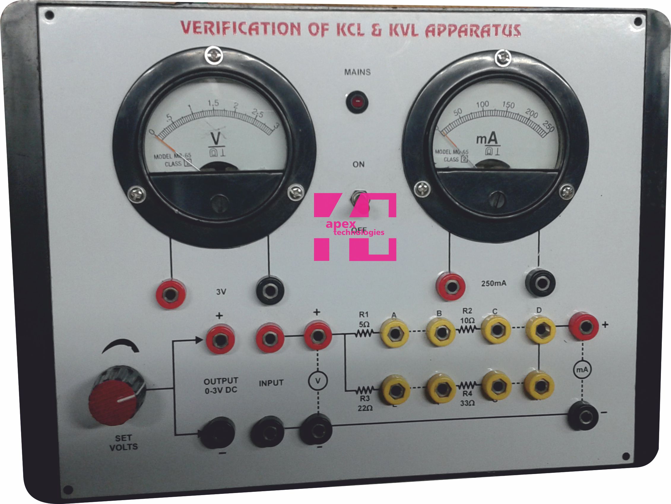 Verification of Kirchhoff’s Voltage Law (KVL) and Kirchhoff’s Current Law (KCL). It states that the algebraic sum of voltage drops in elements & voltage sources in any closed path (or mesh) in an electric network is equal to zero.